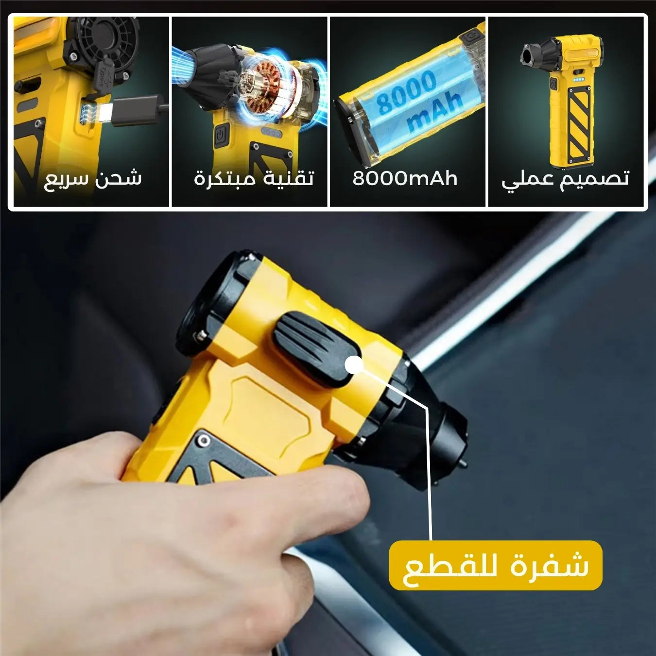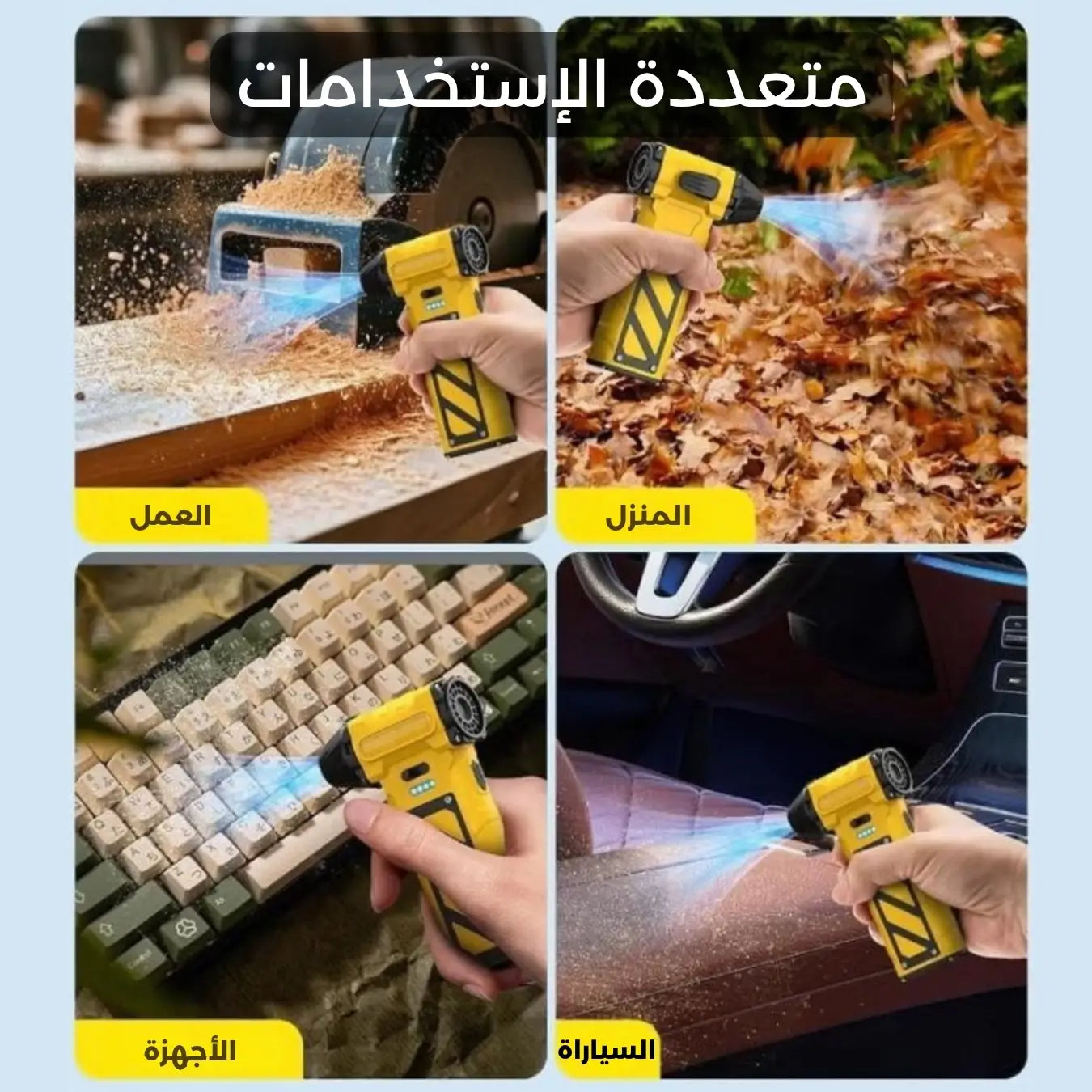 تنظيف السيارات والمكاتب، إزالة الغبار من الأجهزة، نفخ الوسائد الهوائية، والتبريد الخارجي أثناء الرحلات.